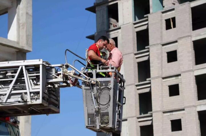 Mersin'de dış cephe çalışması sırasında 13. katta iskelede mahsur kalan 2 emekçi, itfaiye grupları...
