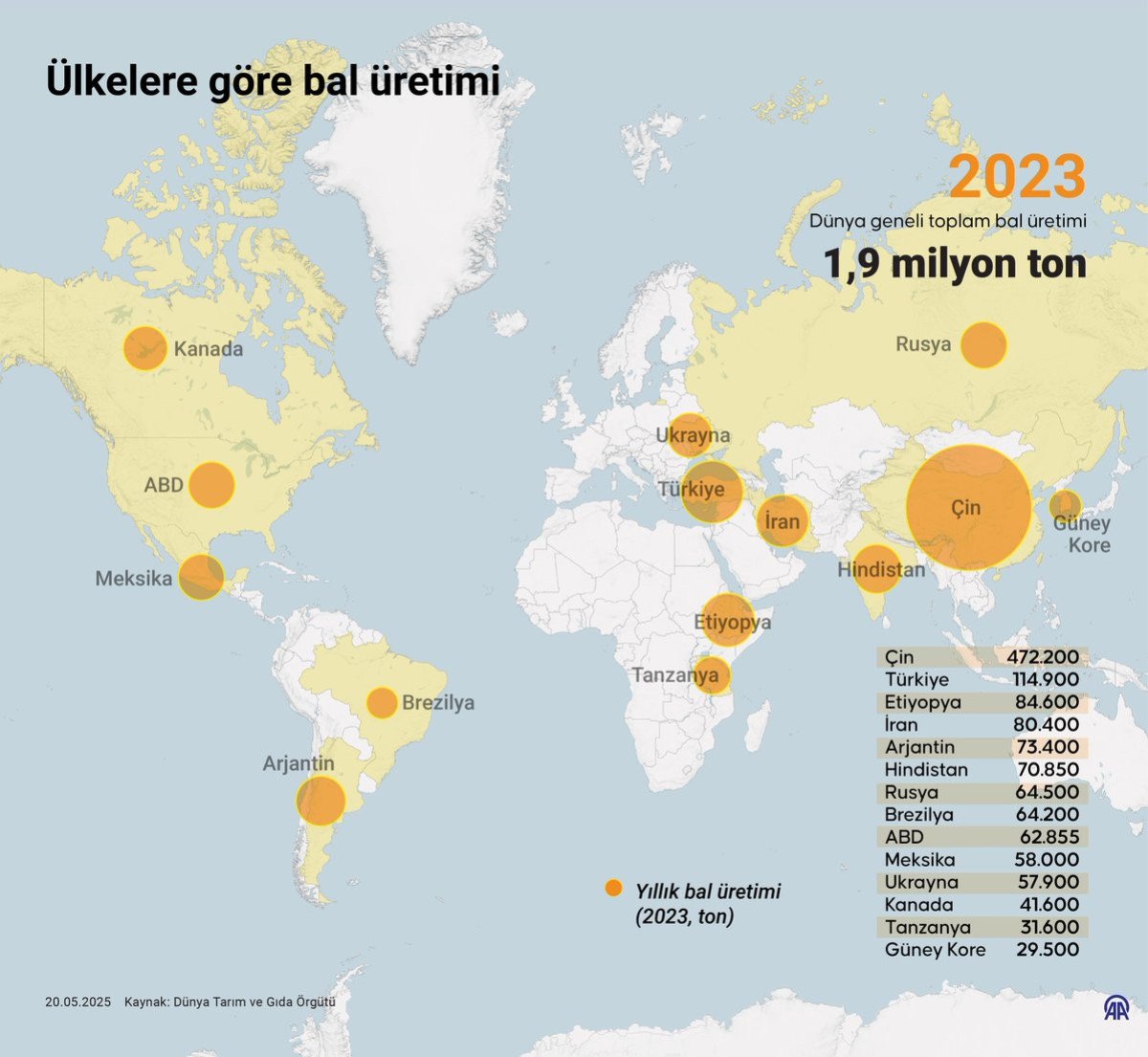 Dünya genelinde 2023 yılı toplam bal üretimi 1,9 milyon ton olarak gerçekleşti.